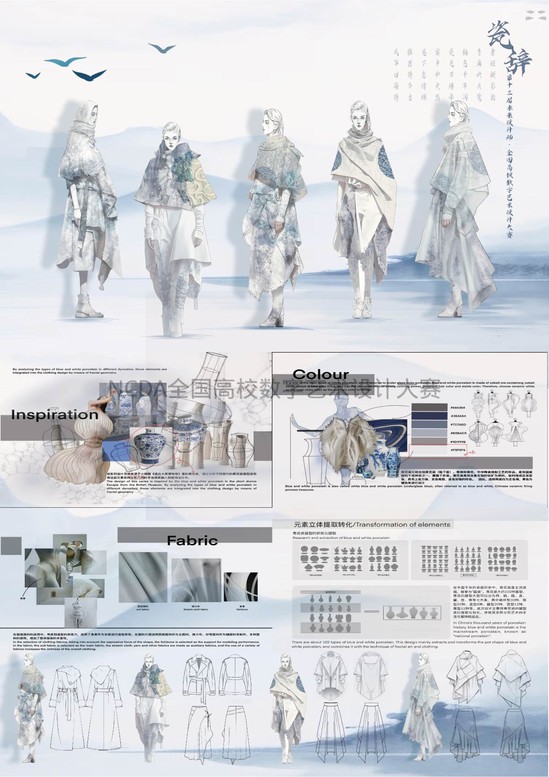 作品简介:《瓷辞》 系列以青花瓷为精神内核,运用分形几何重构传统水墨意境。蓝白渐变面料模拟釉色流动,数码印花将冰裂纹转化为无限递归的曼德博图纹,隐喻微观与宏观的哲学同构。立体剪裁通过参数化褶皱形成自相似肌理,解构式廓形在破碎中建立秩序,暗合道家大制不割的辩证思维。衣身线条随人体曲线延伸,如青花笔触游走于器形与虚空之间,诠释东方美学中器以载道的造物哲学。本系列以数学逻辑重释传统工艺,探寻有限形制与无限意境的共生可能。