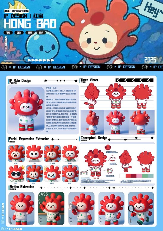 作品简介:作品基于对联合国全球可持续发展目标之一的“水下生物”的响应,聚焦国家一级保护野生动物——红珊瑚,设计了拟人化红珊瑚角色IP“红宝”。通过“红宝”萌系形象传递海洋保护理念,将抽象的海洋保护概念转化为可感知的情感符号。