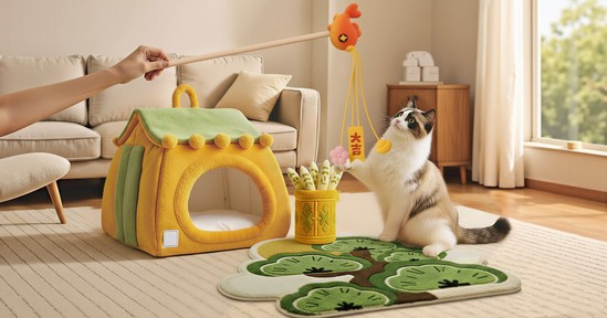 作品简介:作品汲取中国传统建筑的文化意象与青松锦鲤的吉祥美意,打造治愈系宠物家居套装。让当代年轻人在与爱宠的温暖互动中,在优秀传统文化的熏陶中,安放牵挂,疗愈日常,让陪伴成为彼此的心灵归处。