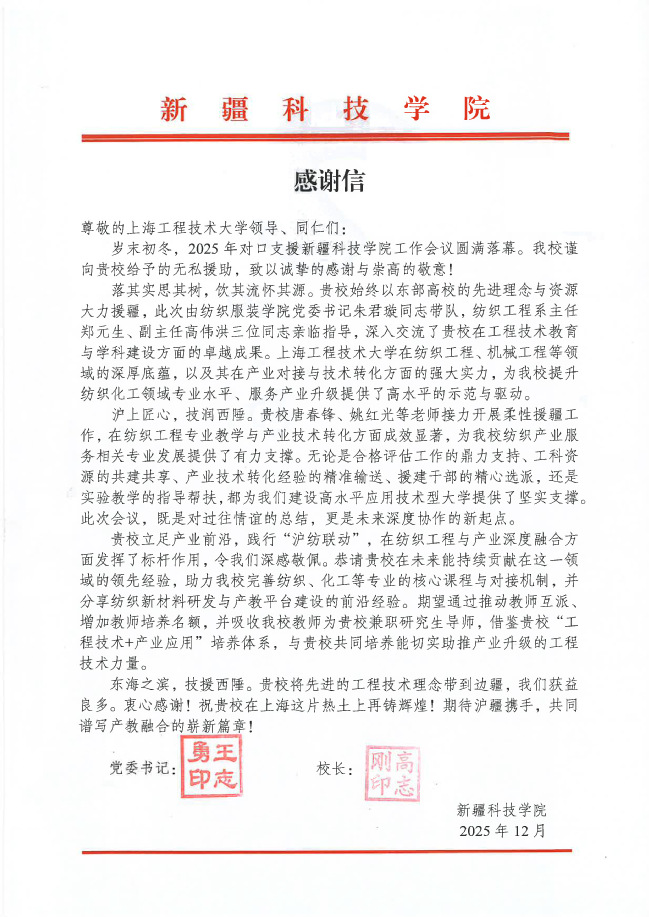 近日,新疆科技学院向yd2333云顶电子游戏发来感谢信,对yd2333云顶电子游戏长期以来在学科建设、合格评估、师资培养和产教融合等方面给予的支持与帮助致以诚挚的感谢和崇高敬意。