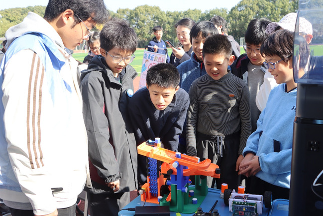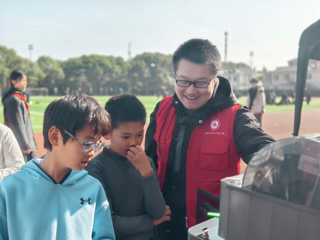 12月18日,上海市松江区三新学校东部分校的校园里,一堂与众不同的“科学课”正热闹上演。来自上海工程技术大学材料科学与工程学院、电子电气工程学院、航空运输学院(飞行学院)的师生组成联合科普团队,以“陆、空、创”为主题,为中小学生打造了一场可触摸、可互动、可探索的“奇妙科学之旅”理科集市。