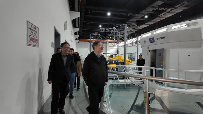陈勇一行实地参观了航空运输学院飞行模拟机实验室、发动机拆装实训区、陆地逃生舱及航空发动机健康监测实验室,并与学院师生进行了深入交流。