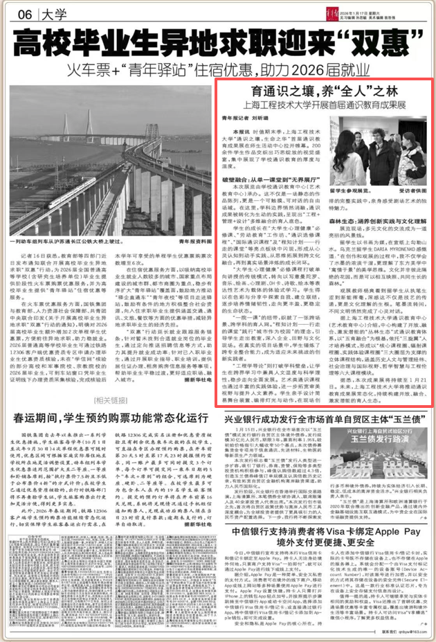 据悉,本次成果展将持续至1月21日。未来,上海工程技术大学将推动通识教育成果展常态化,持续构建开放、融合、激发潜能的育人生态。