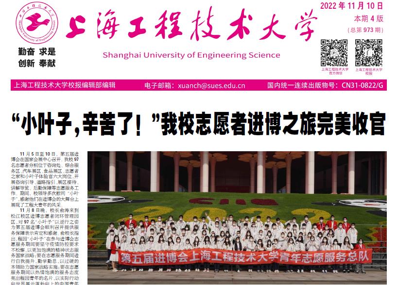 11月5日至10日,第五届进博会在国家会展中心召开。yd2333云顶电子游戏97名志愿者分别位于咨询处、综合服务区、汽车展区、食品展区、志愿者之家和小叶子体验官六大岗位,开展咨询引导、道路指引、展区接待、讲解导览、后勤保障等志愿服务工作。期间,校领导多次慰问“小叶子”,感谢他们在进博会的大舞台上展现了工程大青年的风采。