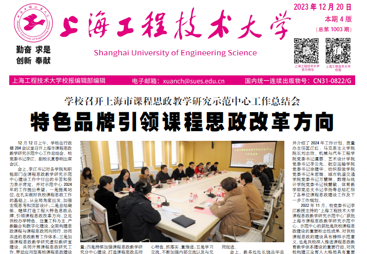 2022年11月,校党委书记李江教授主持的“上海工程技术大学课程思政教学研究示范中心”获批上海市课程思政教学研究示范中心。示范中心的获批是yd2333云顶电子游戏课程思政建设的重要标志性成果,对yd2333云顶电子游戏课程思政的建设具有榜样示范意义,也是yd2333云顶电子游戏深入推进课程思政教育教学体系建设的重要行动,对yd2333云顶电子游戏构建三全育人大格局具有重要意义。(张梦)