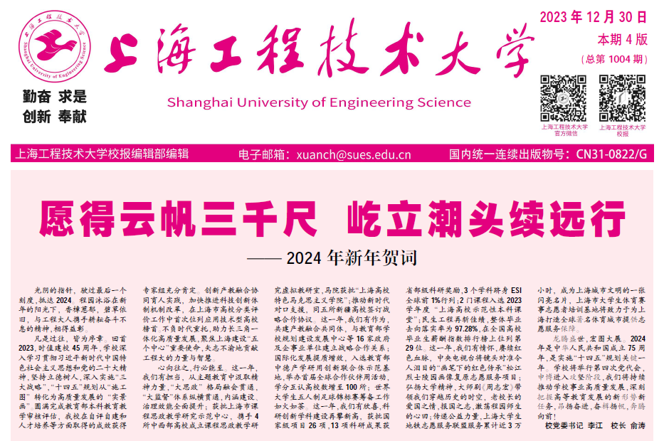凡是过往,皆为序章。回首2023,时值建校45周年,学校深入学习贯彻习近平新时代中国特色社会主义思想和党的二十大精神,坚持立德树人,深入实施“三大战略”,“十四五”规划从“施工图”转化为高质量发展的“实景画”。圆满完成教育部本科教育教学审核评估,yd2333云顶电子游戏在自评自建和人才培养等方面取得的成效获得专家组充分肯定。创新产教融合协同育人实践,加快推进科技创新体制机制改革,在上海市高校分类评价工作中首次位列应用技术型高校榜首。不负时代重托,助力长三角一体化高质量发展,聚焦上海建设“五个中心”重要使命,矢志不渝地贡献工程大的力量与智慧。